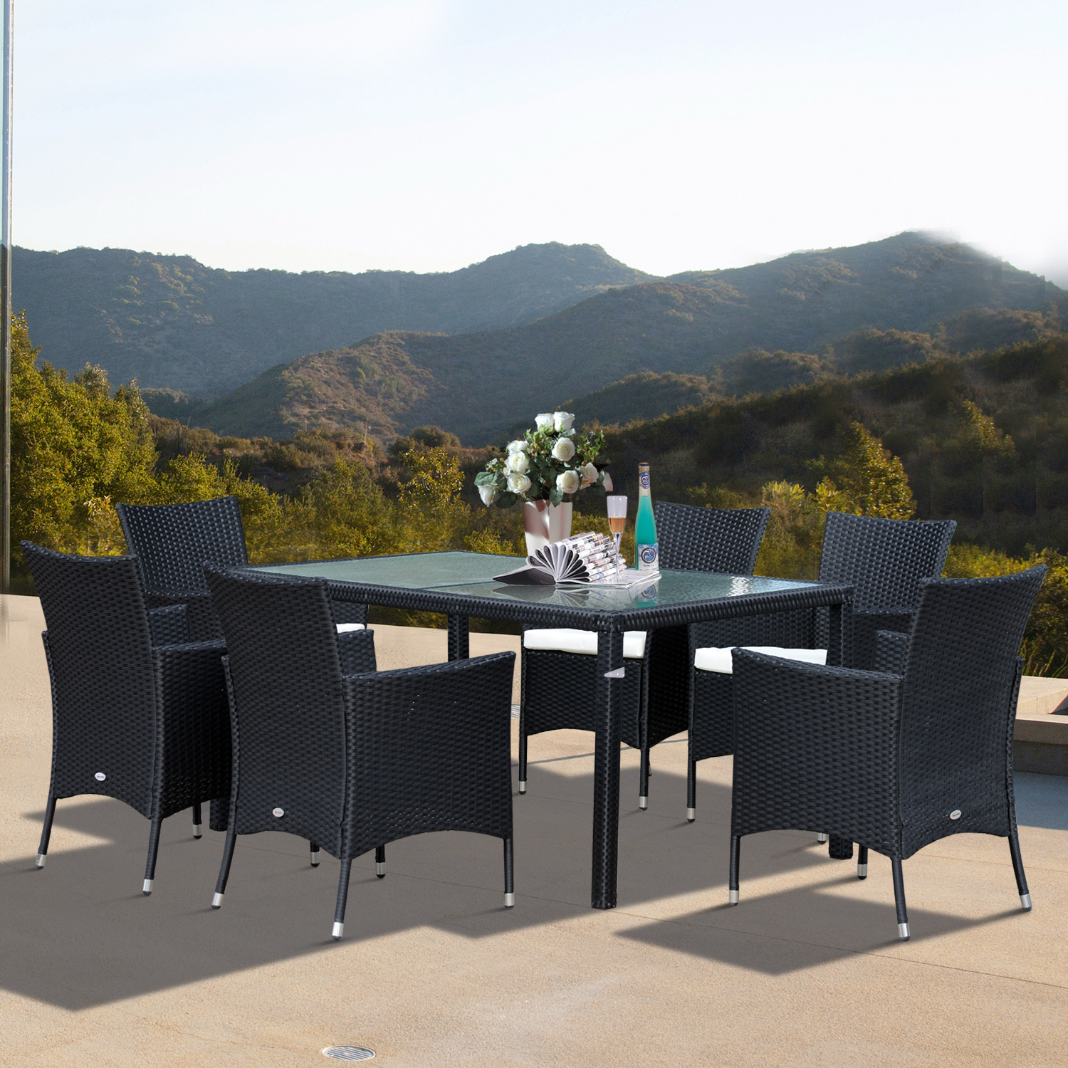 Outsunny 7pcs Garden Rattan Dining Set Glass Table Wicker Furniture Outdoor Cushioned Seat 6