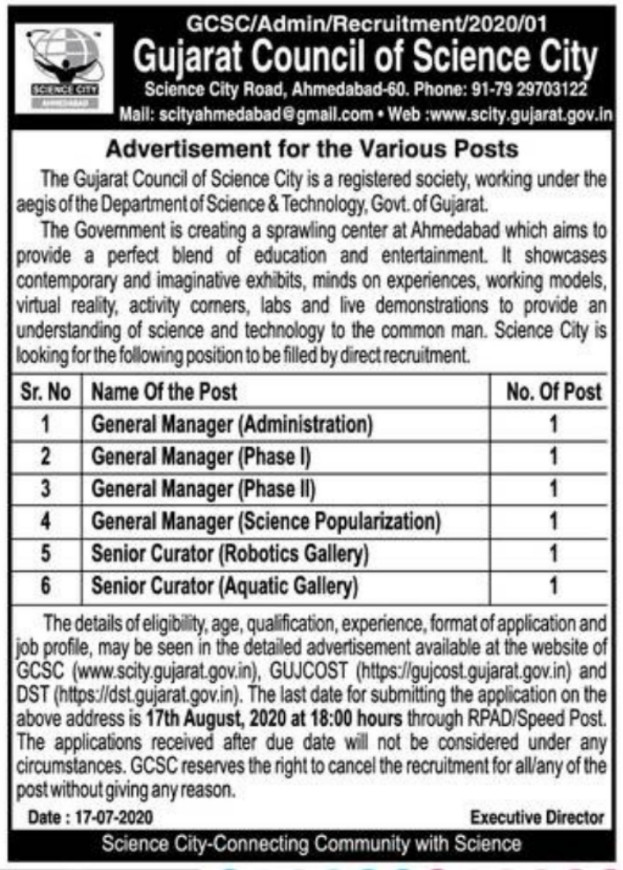 Gujarat Council of Science City (GCSC) Recruitment for General Manager