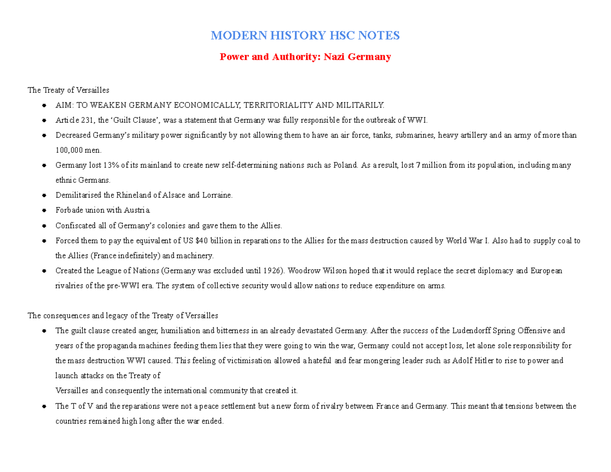 Modern History HSC Notes MODERN HISTORY HSC NOTES Power and Authority Nazi Germany The Treaty