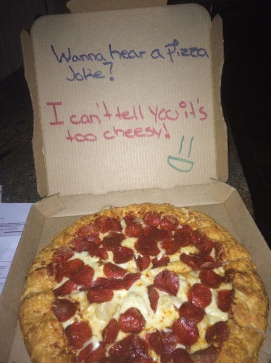 Cheese Pizza Jokes Do you like cheesy pizza jokes? Pizza lovers rejoice because these are the cheesiest pizza jokes you will love. What pizza do dogs eat? Get ready to have a pizza. These pizza puns are going to leave a delicious taste in your mouth. Do you like cheesy pizza jokes? If you are looking for a pizza instagram caption, or to craft a. Whether you like to order a pizza delivery, put a frozen pizza in your oven or make it yourself, pizza is always a good idea. How can you tell if you are in love? If they stole a pizza your. The combo of pizza and puns is a match made in heaven, and we ourselves just couldn't stop chuckling at these corny jokes! Grab the door because we are delivering you the best pizza jokes.