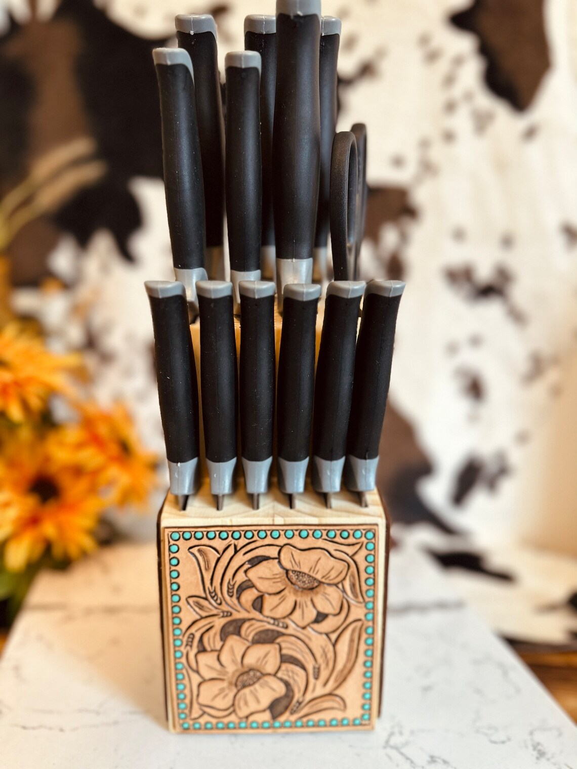 Knife Set Custom Tooled Leather Cow Hide Block Etsy Cowhide decor Tooled Leather Knife Block Our complete custom set is a great option if you want something completely unique and. hand tooled leather panels added to a pioneer woman knife block. check out our leather tooled knife block selection for the very best in unique or custom, handmade pieces from our knife blocks &. check out our custom leather tooled knife block. Tooled Leather Knife Block.
