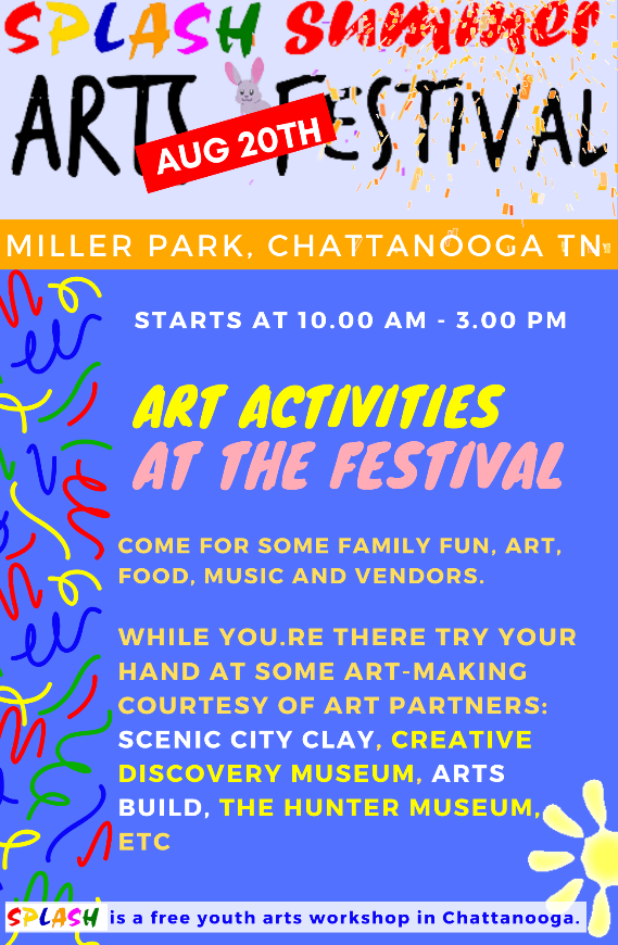 SPLASH Youth Arts hosting a Summer Arts Festival on Aug. 20 Splash Youth Arts Splash is a non profit youth arts workshop that provides free art classes for low income youth. 759 likes · 3 talking about this. Splash is a youth arts workshop mentoring under served youth through free art classes. Charlie and iantha newton, two working artists who have a. We are based in chattanooga tn. Splash youth arts workshop, chattanooga, tennessee.. Splash Youth Arts.