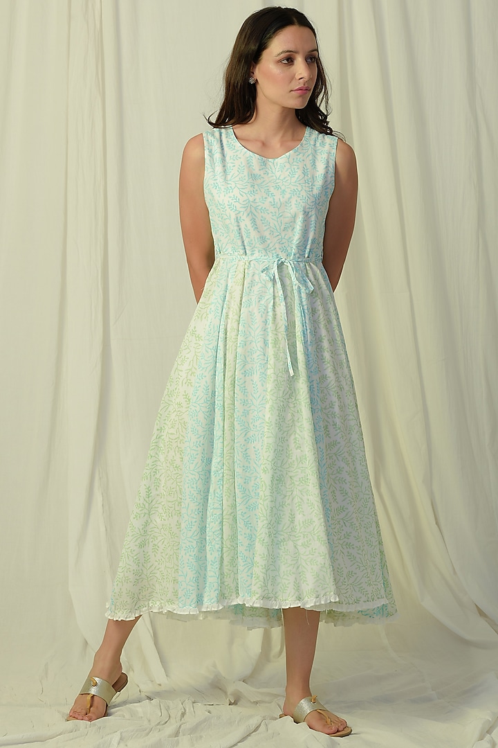 Mint Green Ombre Embroidered Flared Midi Dress Design by Charkhee at