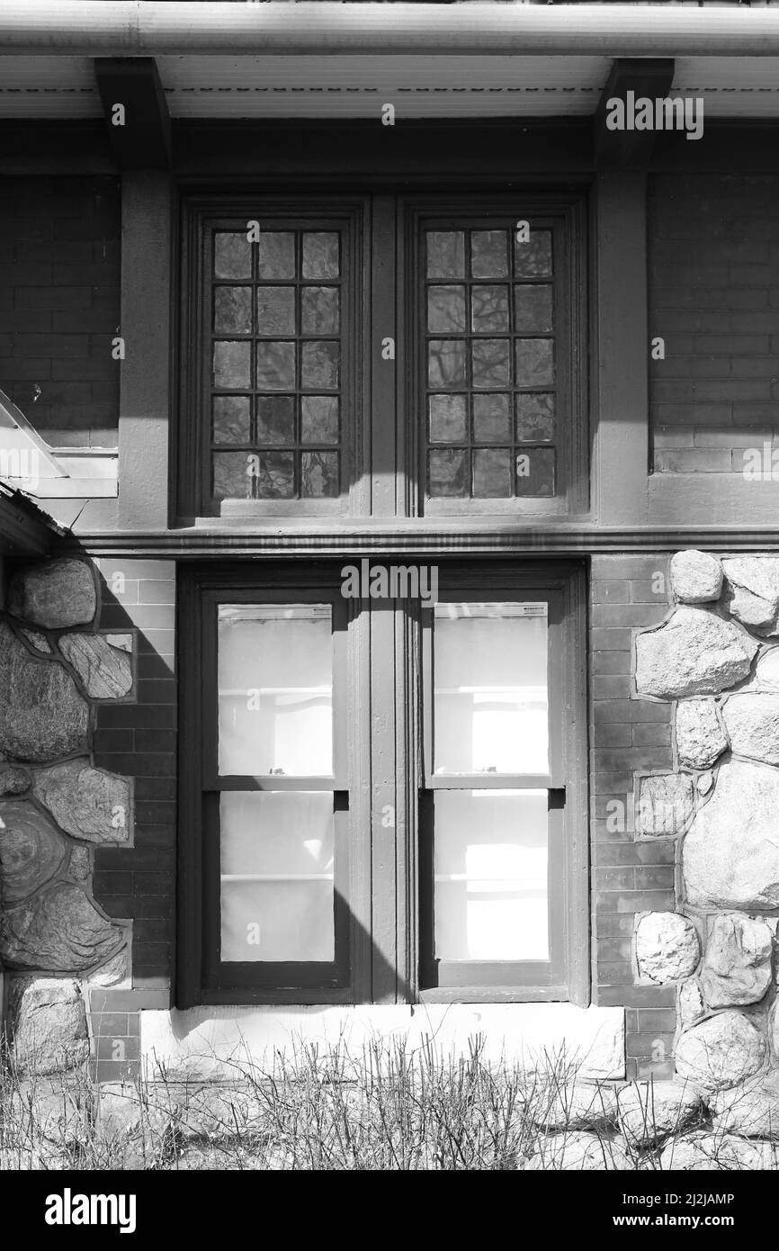 Vintage wooden windows on a charming rustic stone cottage in black and