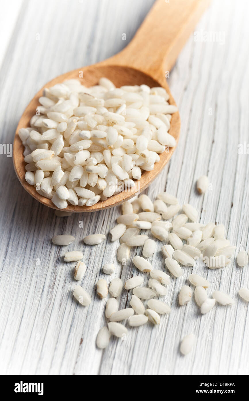 the uncooked arborio rice in wooden spoon Stock Photo Alamy