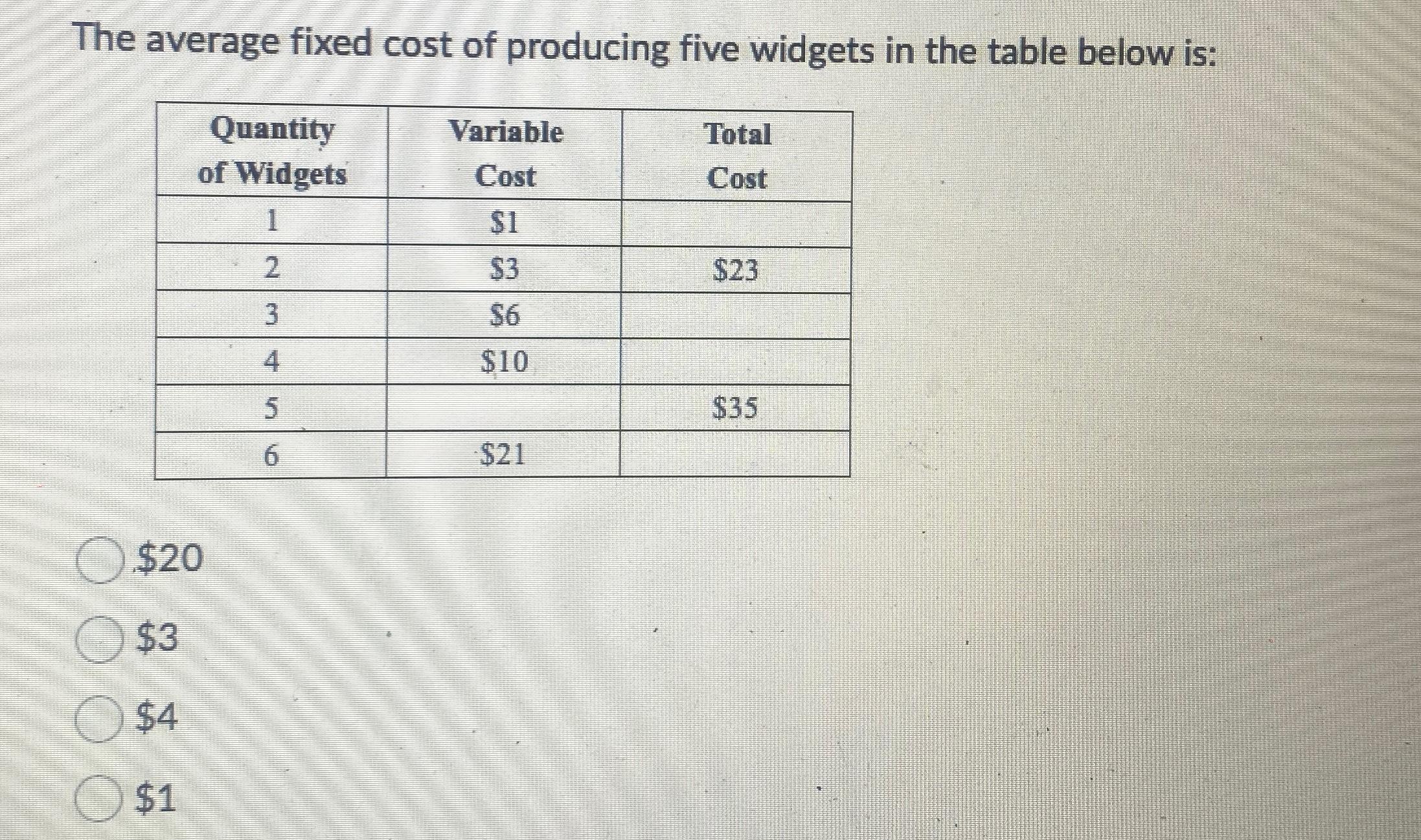 Solved The average fixed cost of producing 5 widgets in the What Is The Average Fixed Cost Of Producing Five Widgets to find the average fixed cost of producing 5 widgets, we need to know the total fixed cost and divide it by the. The most intuitive way is average cost. the average fixed cost of producing five widgets is a. Average cost is the cost on average of producing a given. None of the above are correct. None. What Is The Average Fixed Cost Of Producing Five Widgets.