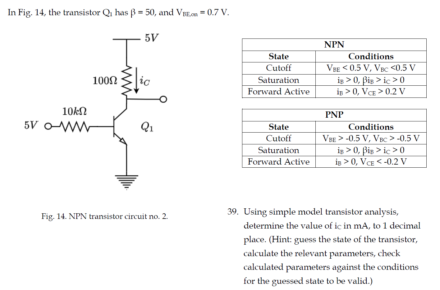 Solved In Fig. 14, the transistor Qı has ß = 50, and VBE,on