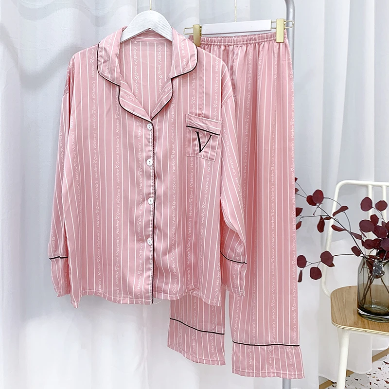 Striped Women's Pajamas 2 Pieces Pjs Set Luxury High Quality Satin Silk