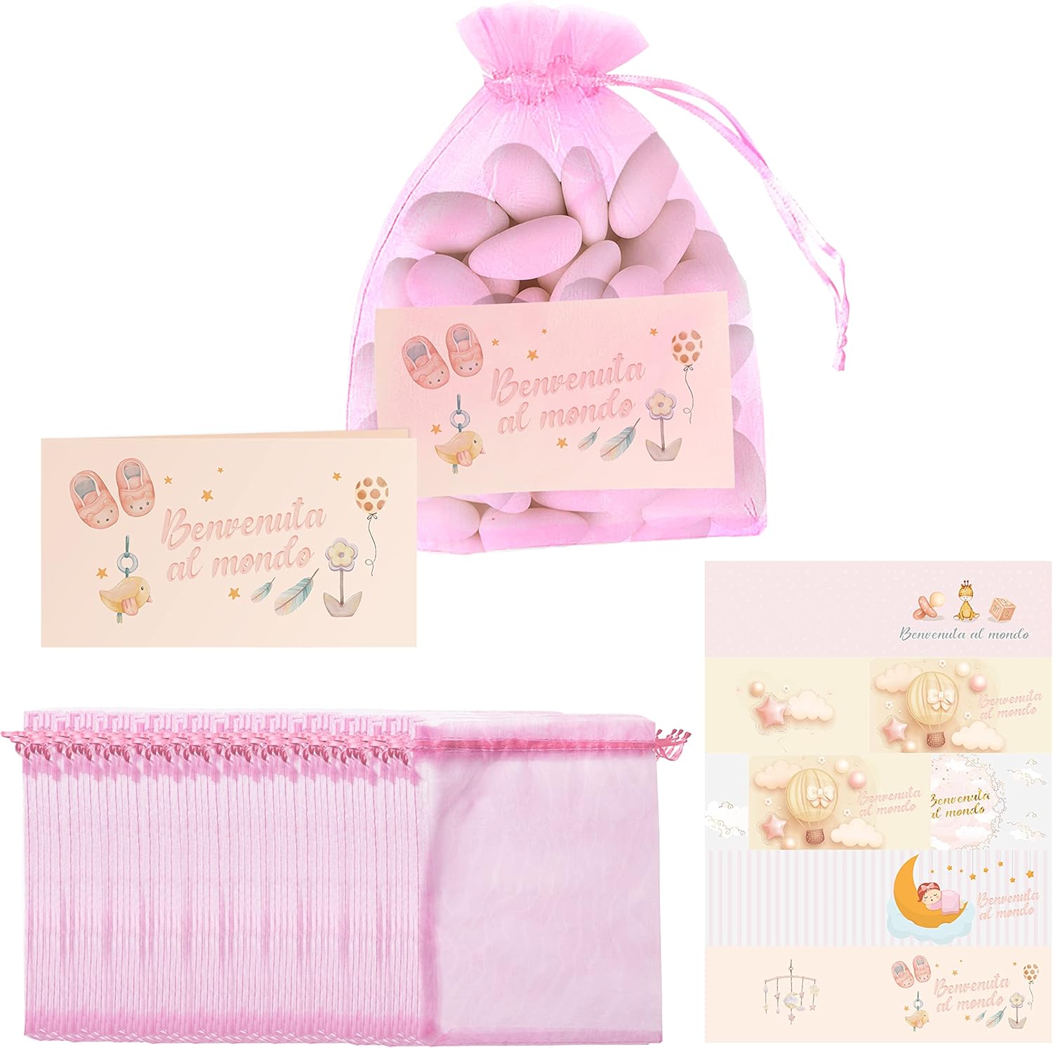 NAÏZAYA Sacchetti Confetti Nascita in Organza con Bigliettini 50