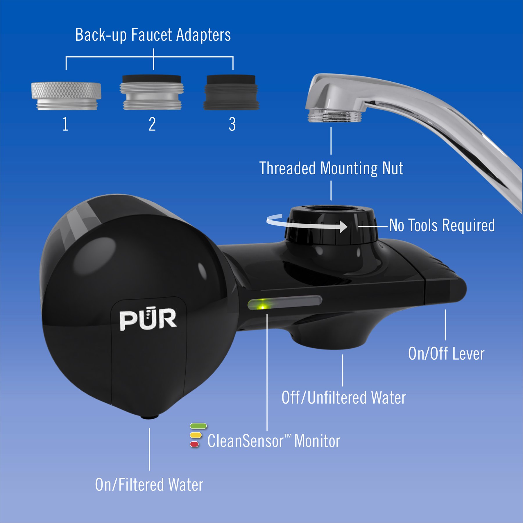 PUR Faucet Mount Water Filtration System, FM3333B, White Pur Horizontal Faucet Mount Water Filter Enjoy cleaner, filtered water from your faucet with the pur plus faucet filter system. Sensor indicates when the filter needs changing; Removes impurities and contaminants from your water; The pur plus faucet mount water filtration system in horizontal, chrome has been engineered to deliver superior water filtration. Conveniently mounts to your existing faucet; Certified to reduce lead and 10x more. Pur Horizontal Faucet Mount Water Filter.