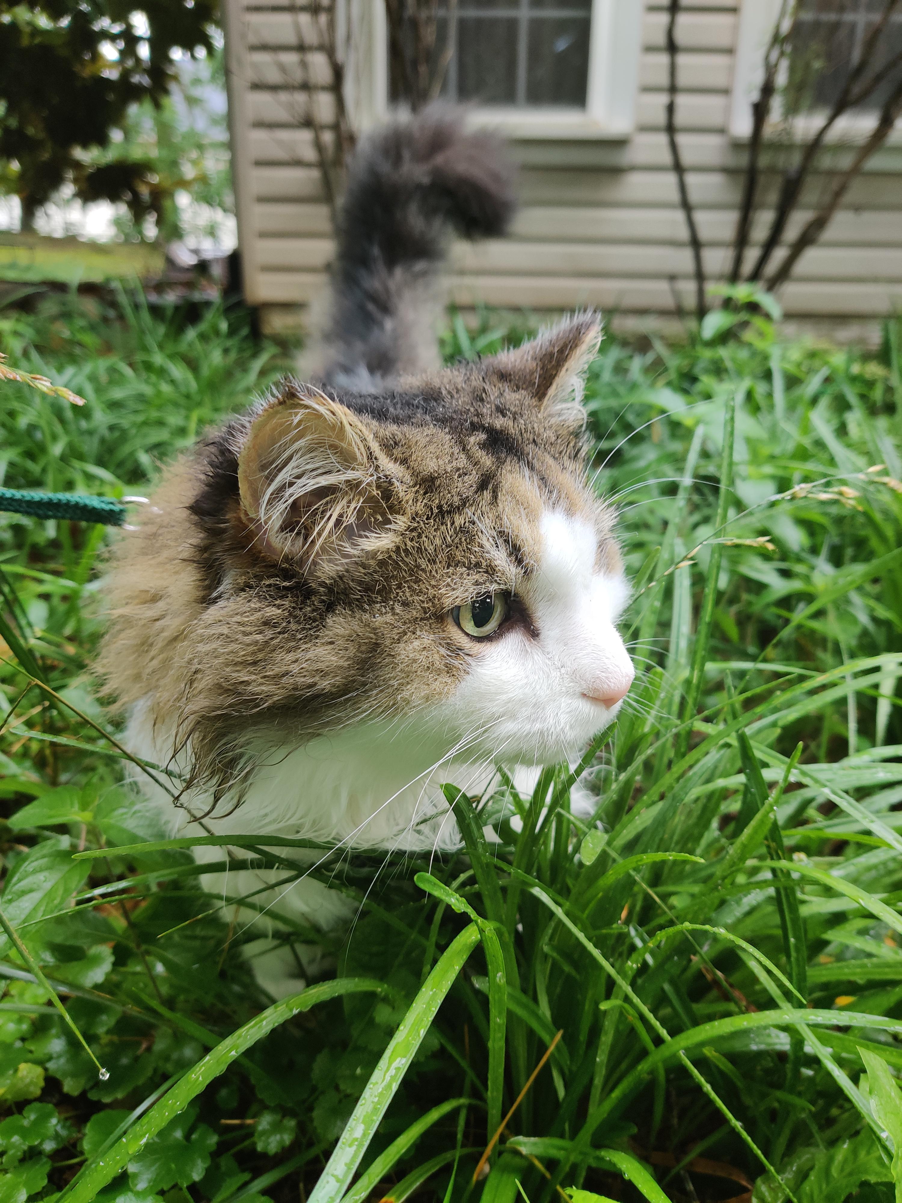 Took my cat for a walk in the rain today, he seemed to enjoy it r/aww