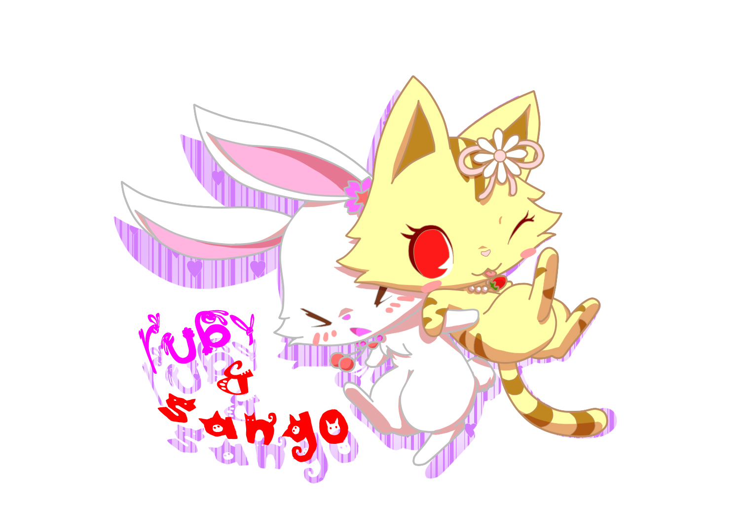 a cat with red eyes and a bow around its neck is standing in front of a pink background Jewelpet Sango She's a yellow and brown striped tabby cat who symbolizes luck, and she wears a red and white bow and a necklace shaped like a strawberry. Jewelpets trying to cheer up ruby after she failed. Concept sketches of jewelpets chibi expressions for jewelpet sunshine. Sango alongside other jewelpets in the opening sequence. Sango is miria's secondary jewelpet partner. She is. Jewelpet Sango.
