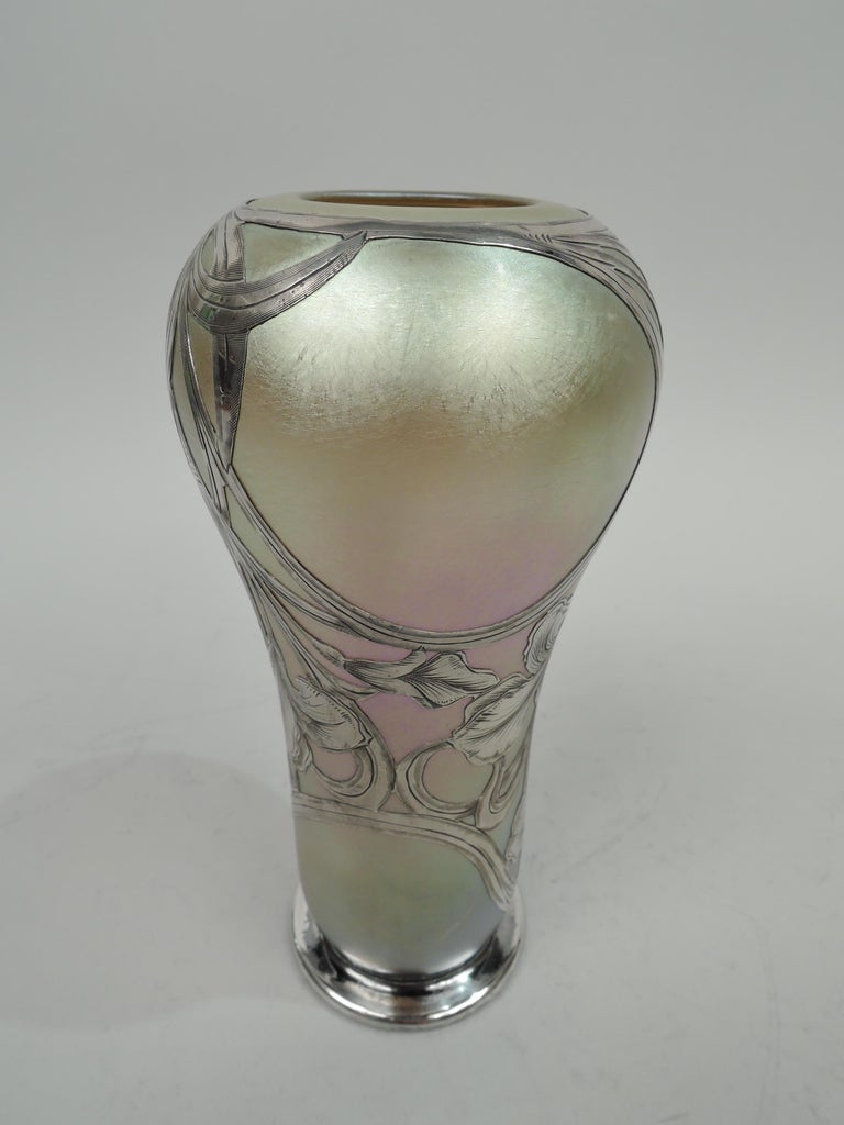 Quezal New York Art Nouveau Iridescent Silver Overlay Vase For Sale at
