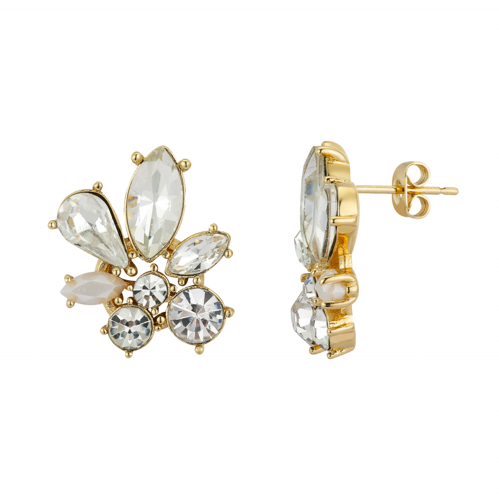 Gold Clear Multi Crystal Cluster & Pearl Post Earrings Sparkle With