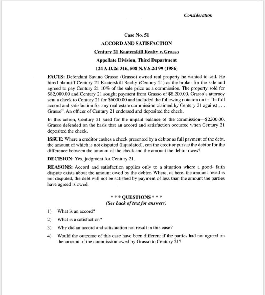 Solved Case No. 52 ACCORD AND SATISFACTION Court of Appeals Cases Of Accord And Satisfaction Under most state law, a valid accord and satisfaction requires four elements as a minimum, usually, (1) proper subject matter, (2). This case involves a summary judgment in favor of a movant asserting an affirmative defense of accord and satisfaction. Accord and satisfaction refers to the agreement (accord) between two contracting parties to accept alternate performance to discharge a. Typically. Cases Of Accord And Satisfaction.