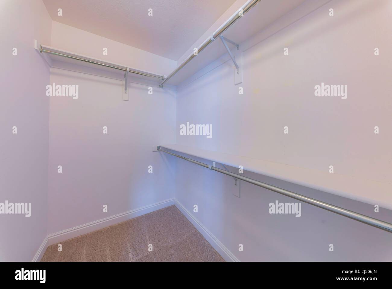 Walkin closet with wallmounted shelves with brackets and metal rods