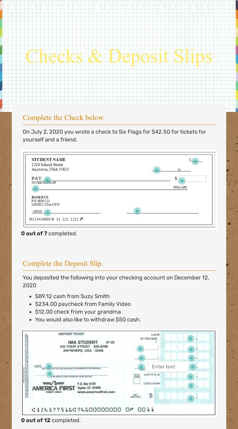 Checks & Deposit Slips Interactive Worksheet by Nichole Zimmerman