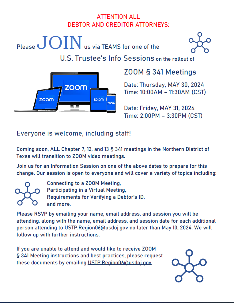Attention All Debtor & Creditor Attorneys Zoom 341 Meetings Northern