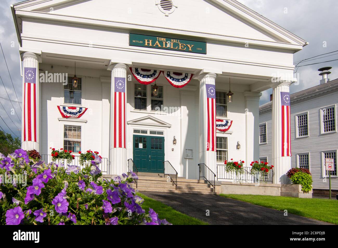 The Hadley, Massachusetts, Town Hall draped in flags to celebrate