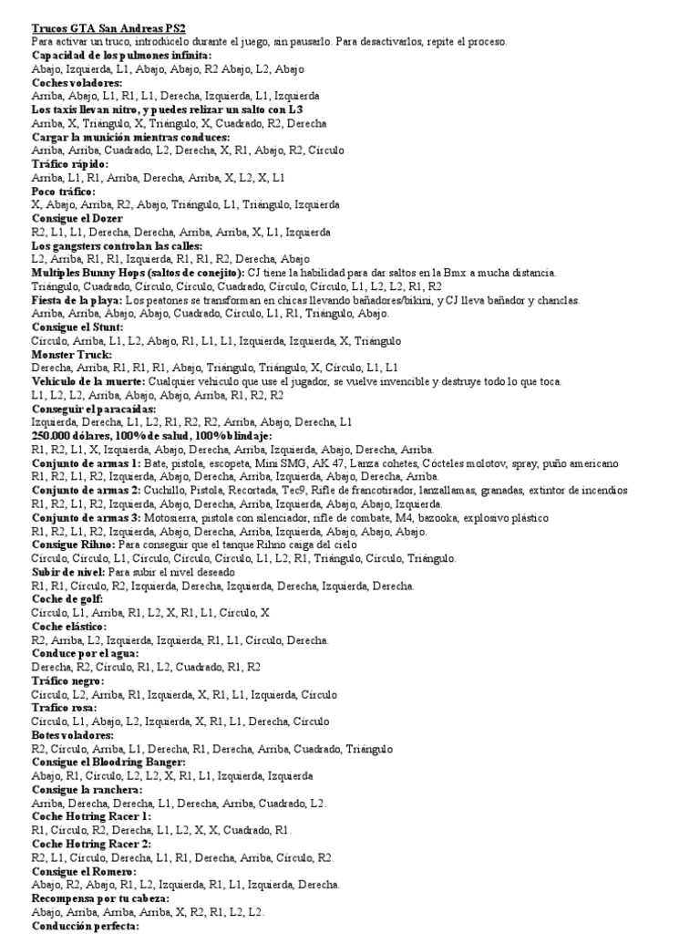 Trucos juego gta san andres para ps2 Trucos De Gta San Andreas Ps2 Formula 1 Para conseguir todas las armas sin antes terminar el juego, es necesario utilizar trucos. Los jugadores pueden encontrar trucos y cheats para grand theft auto san andreas ps2 en línea, en sitios web de juegos y foros de discusión. Con estos códigos, podrás obtener dinero infinito, los mejores carros del juego y todas las armas que quieras. Dinero, autos y. Trucos De Gta San Andreas Ps2 Formula 1.