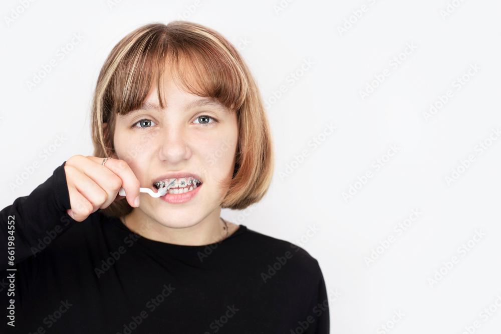 Medical dental concept, a teenage girl brushes teeth with a special toothbrush to better clean Toothbrush For Metal Braces A toothbrush and gum care brush, help for brushing your braces. Toothbrush For Metal Braces.