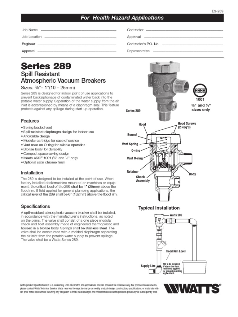 Series 289 Spill Resistant Atmospheric Vacuum Breakers PDF Valve