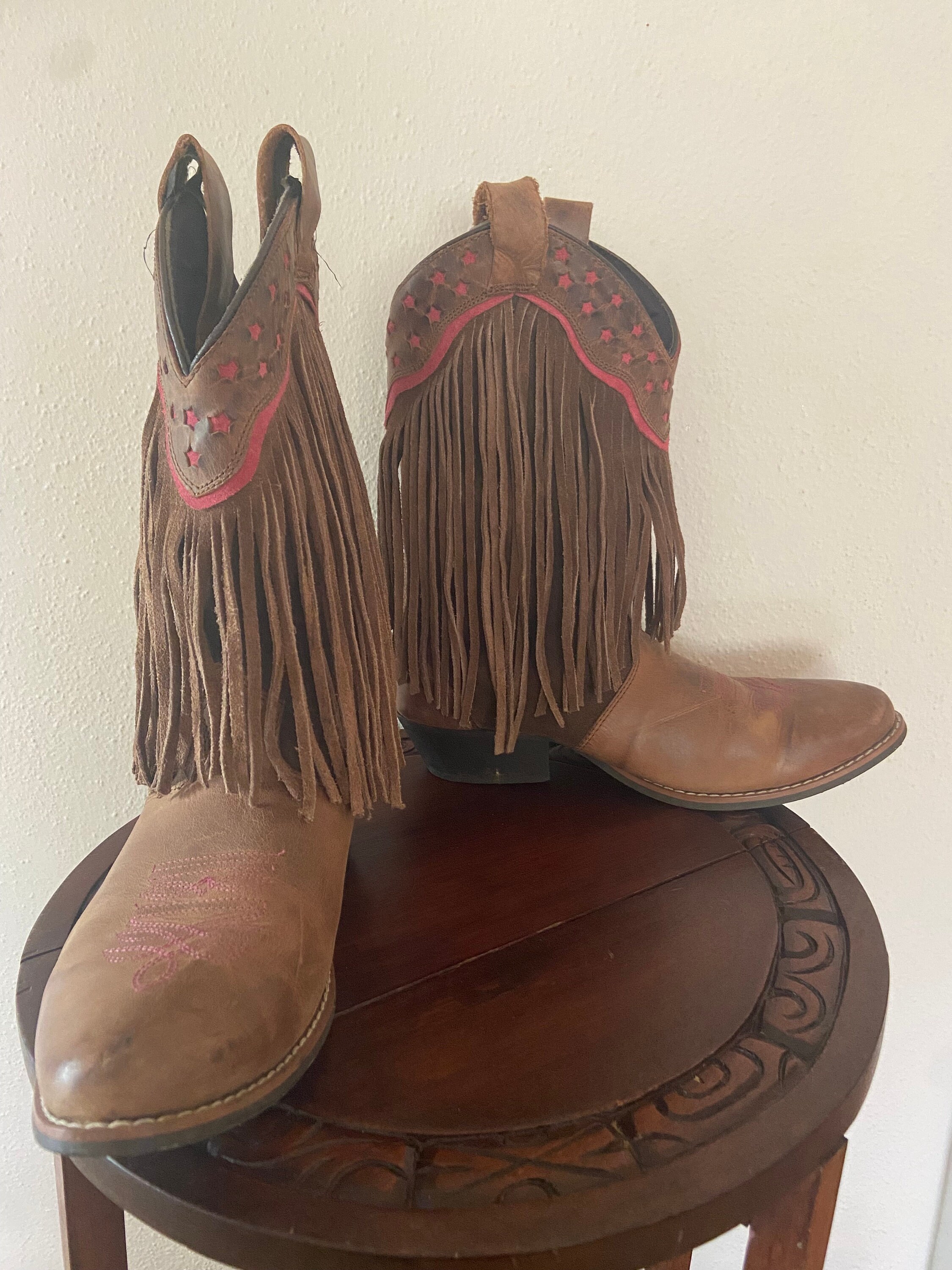 Genuine Leather Cowgirl Boot With Red Stars and Long Fringe Etsy