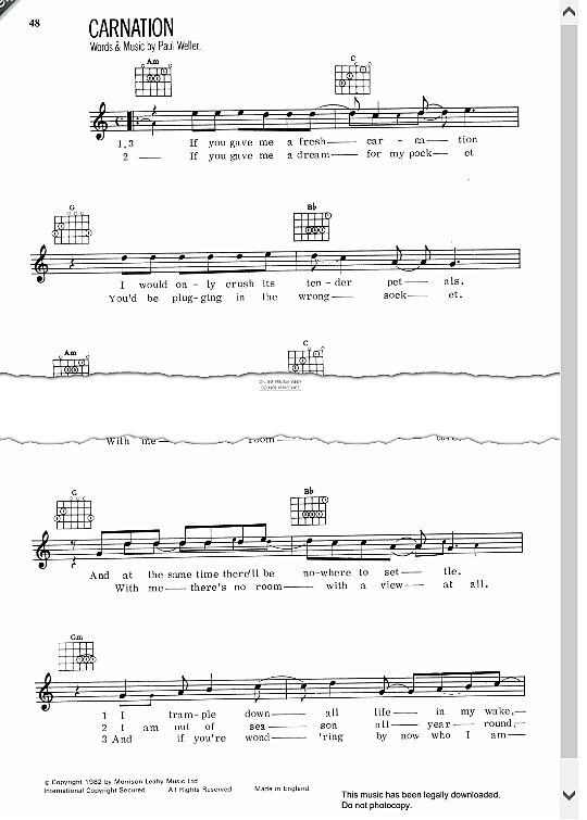 Carnation (The Jam) by P. Weller sheet music on MusicaNeo Carnation Jam Chords D, am, e, g, bb. You can find and view more than 1,000,000 chords or tabs. Play along with original audio. Carnation chords by the jam. Play on keyboard, ukulele, bass, guitar & mandolin in song key g, capo 0 fret. Am, c, g, d, e. Carnation by jam chords different versions chords, tab, tabs. All lyrics and breaks with. Carnation Jam Chords.