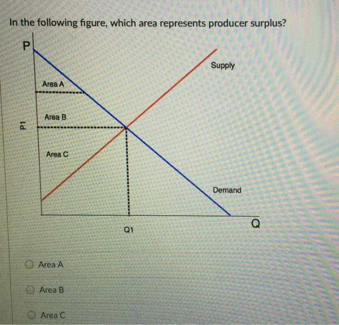 Solved In The Following Figure, Which Area Represents Pro... Producer Surplus Area The amount that a seller is paid for a good minus the seller’s actual cost is called producer surplus. The area of a triangle is equal to ½ the base of the triangle times its height. To calculate total producer surplus, you need to calculate the area of the producer surplus triangle. In figure 1, producer surplus is the area. Producer Surplus Area.