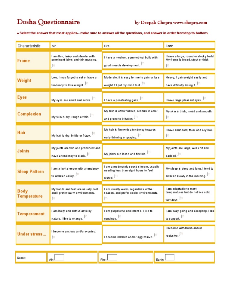 Dosha Body Questionnaire Complete with ease airSlate SignNow Ayurveda Dosha-Test Pdf (it is a good idea to take this twice.) click here to print your dosha assessment or. Excess kapha can build up from from sleeping in, napping, living a sedentary lifestyle, and eating sugary or fried foods. Discover your unique dosha type and learn how to live a healthier and more balanced life according to ancient ayurvedic wisdom. According to. Ayurveda Dosha-Test Pdf.