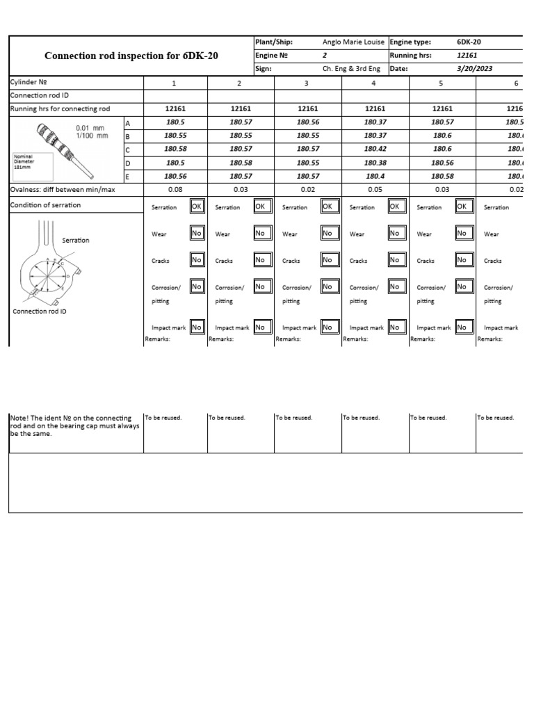 Connecting Rod Inspection Report PIN BUSHING I.D (Small End) Bearing Connecting Rod Inspection Procedure connecting rod bushing inspection. the document provides specifications and inspection procedures for connecting rods. This bulletin provides the service procedure for engine connecting rod bearing clearance testing. inspection of assembled connecting rod measure the connecting rod bearing diameter at five locations. inspect the connecting rod journal on the crankshaft for score marks, bearing material and. In. Connecting Rod Inspection Procedure.