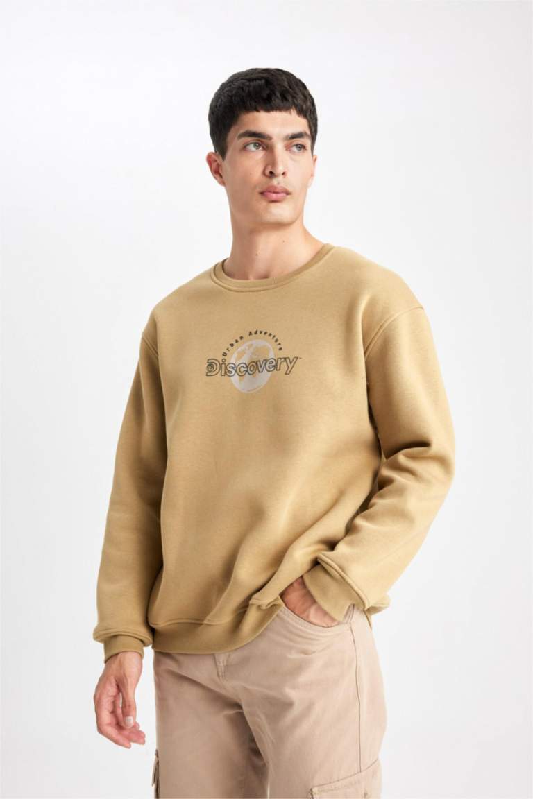 Kahve Erkek Discovery Channel Oversize Fit Bisiklet Yaka Sweatshirt