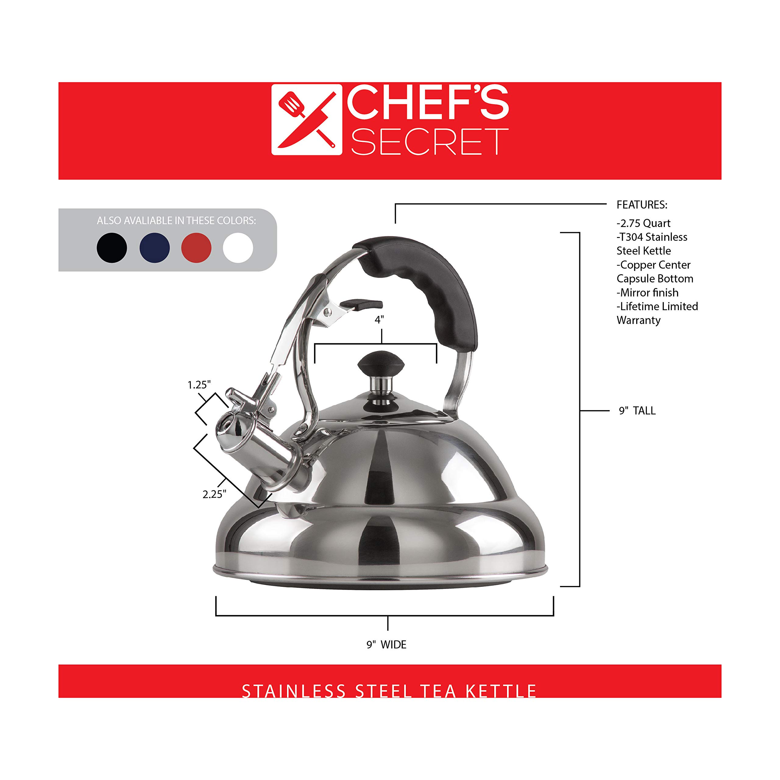 Chef's Secret 2.75Quart T304 StainlessSteel Tea Kettle, A Powerfully