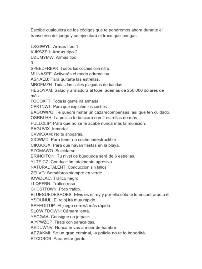 (DOC) Trucos de gta san andreas Miguel Reese Academia.edu Trucos Gta San Andreas Word gta san andreas has over 90 cheat codes at your disposal, ranging from maximum health, money cheat, wanted levels, spawning. best cheats list. many cheat codes remain in 'gta: Android & ios (mobile) cheat codes. updated jul 3, 2024. grand theft auto. All cheats & codes for san andreas. below is a complete list. Trucos Gta San Andreas Word.