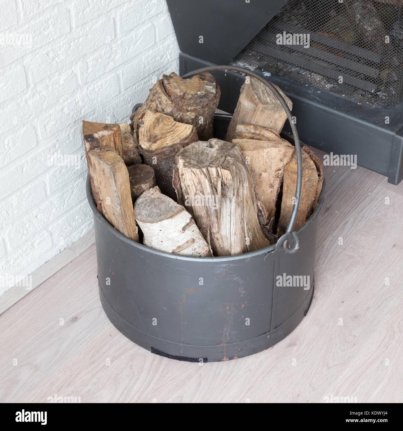 Metal basket of firewood, standing next to a fireplace Stock Photo Alamy