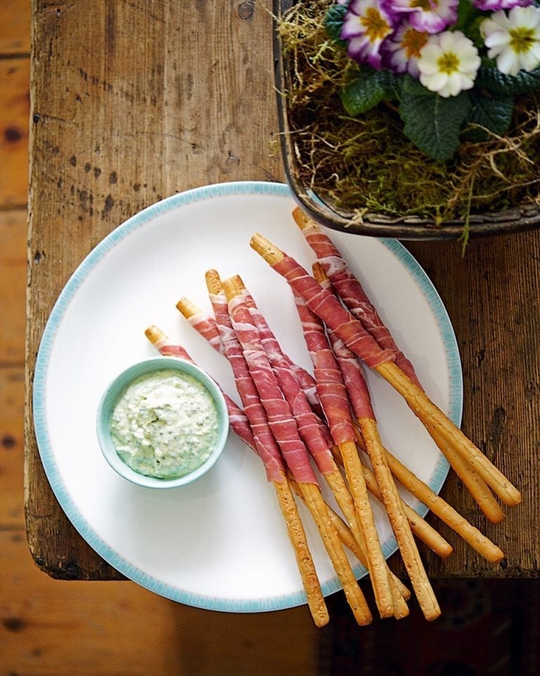 Parma hamwrapped grissini with pesto dip recipe delicious. magazine