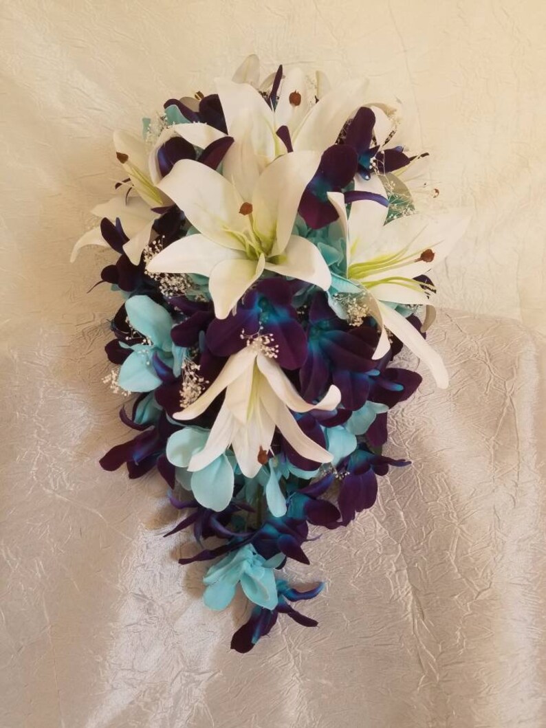 Blue Orchid cascading teardrop wedding bouquet with white Casablanca Casablanca Lilies And Orchids The flower is pure white with white. the article covers various topics, including the ideal growing conditions for casa blanca lilies, watering and soil requirements, pest and disease control. the casablanca lily is a stunning flower known for its large, fragrant white blooms. Its blooms start from mid summer to the late summer and possess unique features. Native. Casablanca Lilies And Orchids.