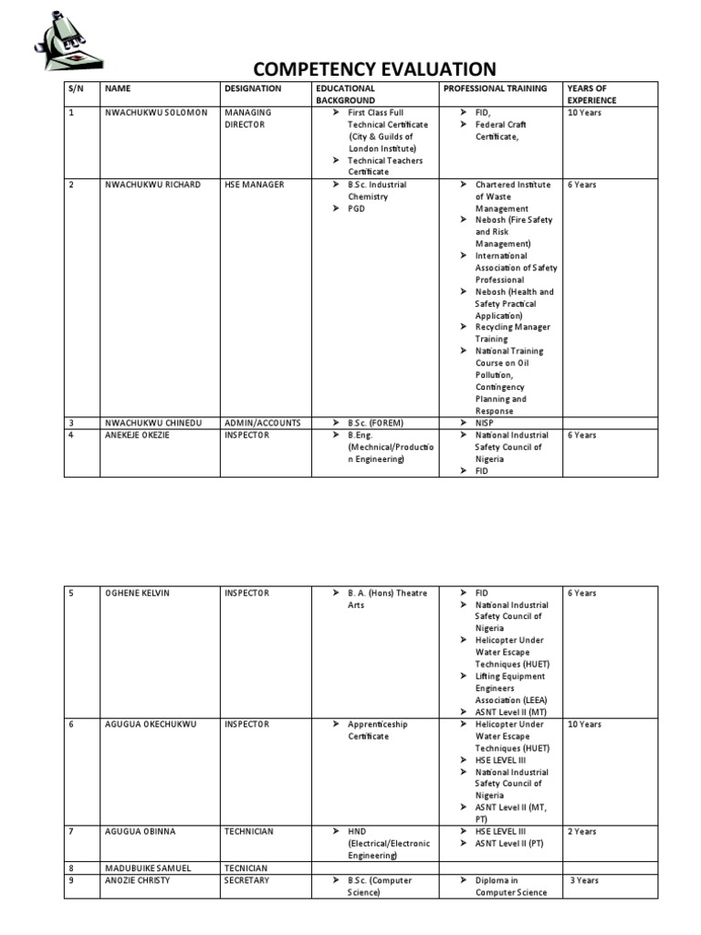Competency Evaluation S/N Name Designation Educational Background