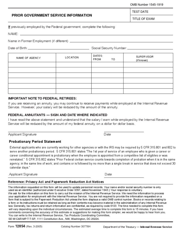 US Internal Revenue Service Form12854 Internal Revenue Service