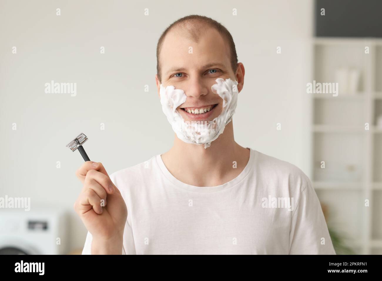 Young man shaving in bathroom Stock Photo Alamy