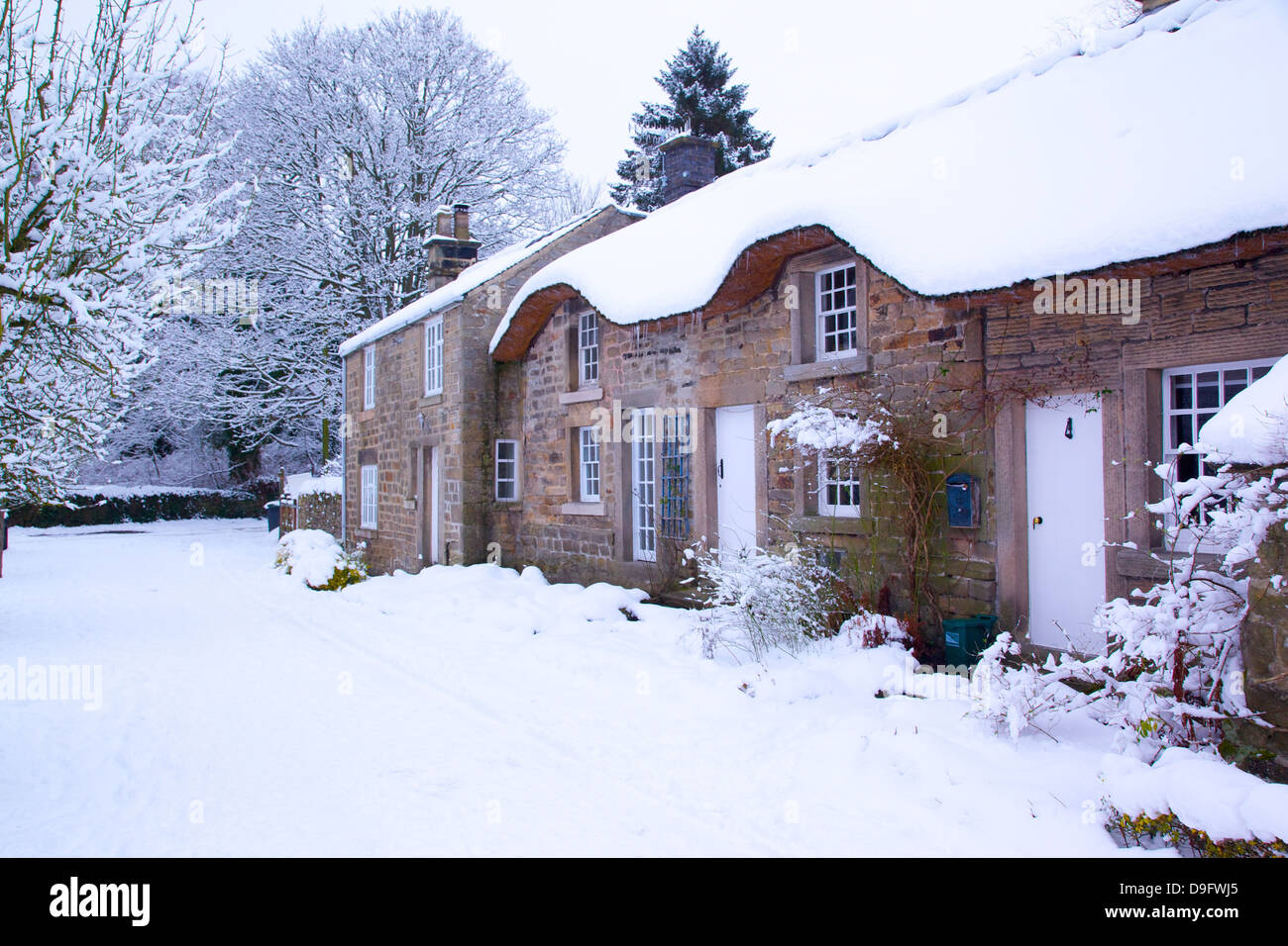 Thatched cottages in the snow, Baslow, Derbyshire Dales, Derbyshire