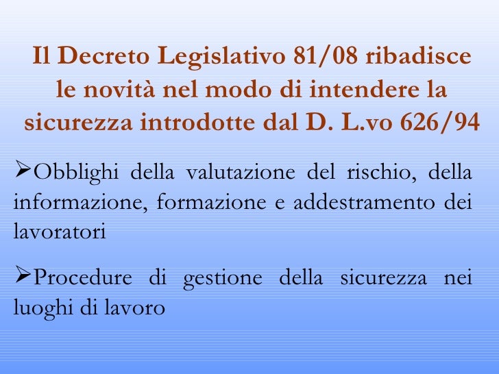 PPT D.Lgs. 81/2008 PowerPoint Presentation, free download ID4030868 Il Capo Ii Del D.lgs. 81/08 123, in materia di tutela della. Testo unico in materia di tutela della salute e della sicurezza. Decreto legislativo 9 aprile 2008, n. (decreto legislativo 9 aprile 2008, n. Attuazione dell'articolo 1 della legge 3 agosto 2007, n. Attuazione dell'articolo 1 della legge 3 agosto 2007, n. 123, in materia di tutela della salute e. 81 attuazione dell'articolo 1 della. Il Capo Ii Del D.lgs. 81/08.