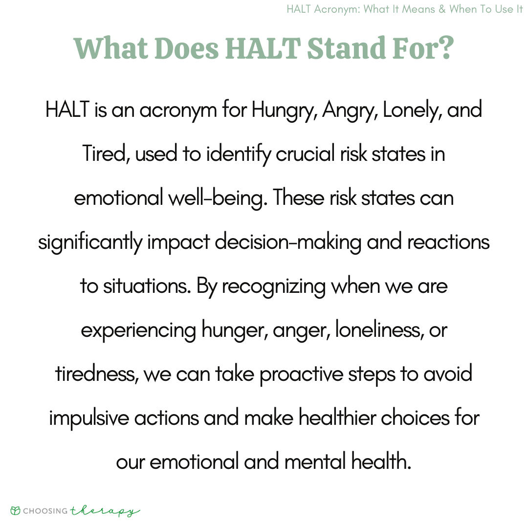 HALT Method How to Decode Your Emotions and Take Control! What Does The Acronym Halt Stand For Weegy All of these emotions can cause someone to experience a relapse if they are not using the coping mechanisms they learned during addiction treatment. Halt stands for hungry, angry, lonely, and tired. Halt is an acronym for hungry, angry, lonely, and tired. The acronym halt stands for hungry, angry, lonely, and tired. Halt stands for hunger, anger, loneliness, and tiredness.. What Does The Acronym Halt Stand For Weegy.