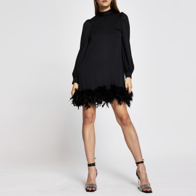 Black long sleeve feather swing mini dress River Island