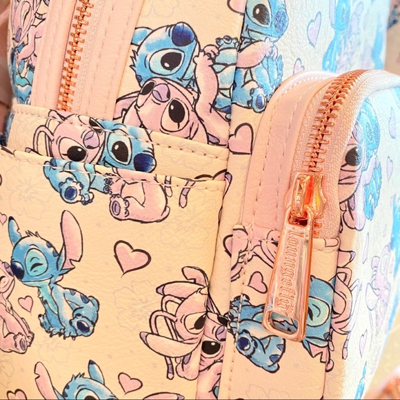 loungefly x disney lilo & stitch angel and stitch sweet treats print mini backpack the feisty stitch shows his romantic side when he's paired with his boojiboo, angel, on this simulated leather mini backpack from loungefly. the feisty stitch shows his romantic side when he's paired with his boojiboo, angel, on this mini backpack from loungefly. say aloha to extraterrestrial fun with this stitch and angel mini backpack! loungefly disney stitch mini backpack.