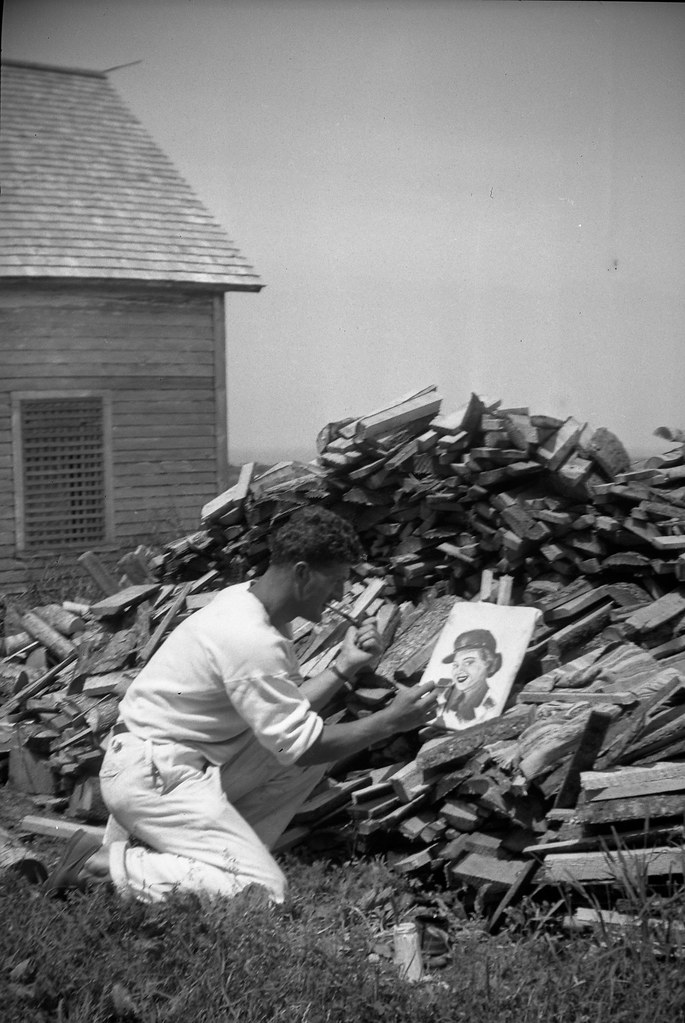 Andre LeBlanc, artist by wood pile, made from negative Flickr