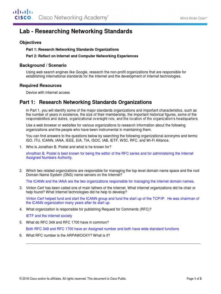 1.4.4.3 Lab Researching IT and Networking Job Opportunities Lab - Researching Networking Standards this document outlines a lab assignment to research networking standards organizations. in part 1, you will identify some of the major standards organizations and important characteristics, such as the number of years in existence, the size of. in this lab, you will complete the following objectives: this document discusses research networking standards organizations and their roles.. Lab - Researching Networking Standards.
