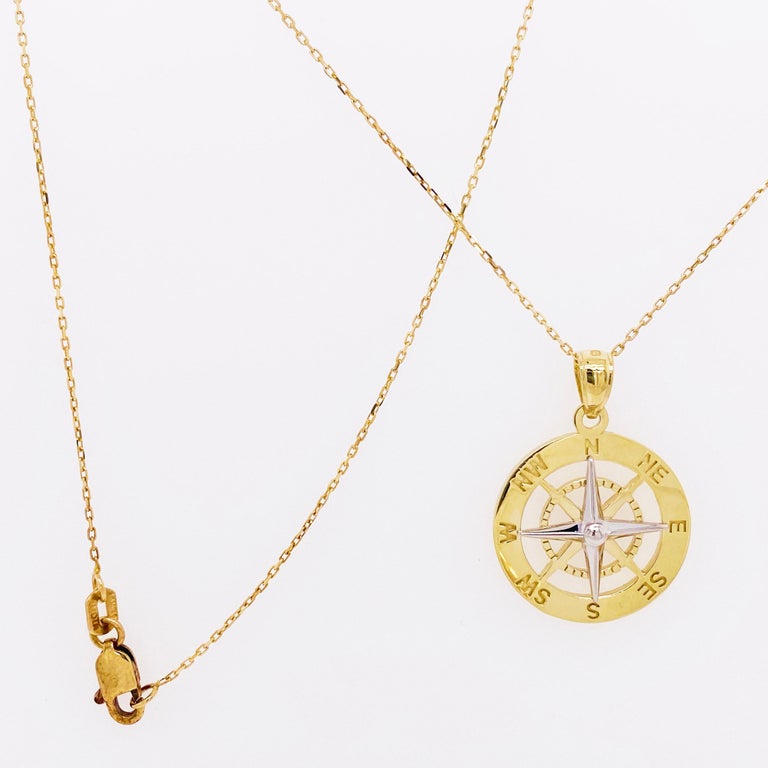 Gold Compass Necklace, 14 Karat Yellow White Gold, Journey to Follow