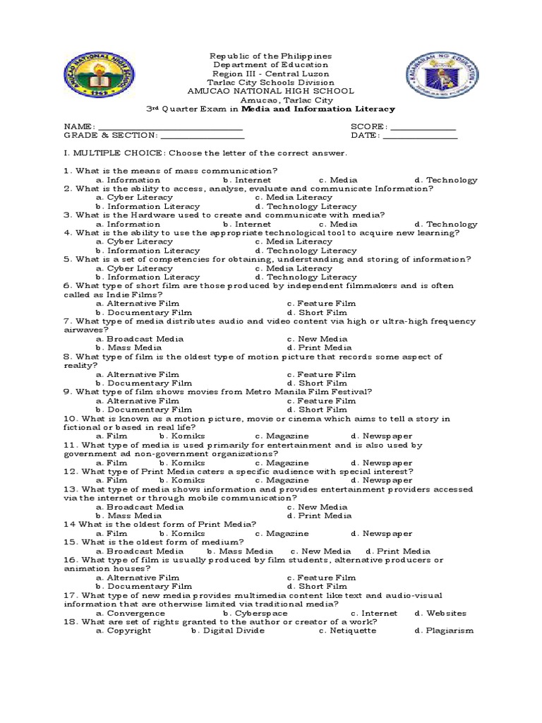 3rd Quarter Exam in Media and Information Literacy PDF Mass Media Newspapers