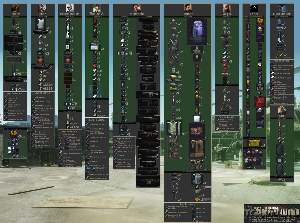 V3 of my Tarkov Barter Items to Keep Infographic for New Players r What Should I Keep In Tarkov Ragman > jaeger > therapist > mechanic > prapor > skier > peacekeeper > fence. All quests quests (find in raid) hideout quests rewards. You have everything you need there, items to keep, quests tracking, maps and much more. The current best order to sell your tarkov loot to traders is: Is there a checklist of loot that one should. What Should I Keep In Tarkov.